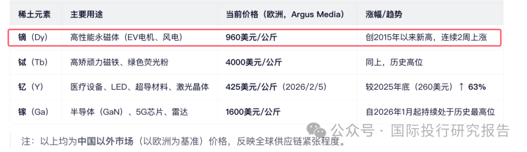 1 、2026年初,全球稀土价格持续攀升,多个关键品种创下历史新高。据英国权威机构Argus Media数据显示,截至2月上旬,用于制造高性能永磁体的镝(Dy)在欧洲市场价格已达每公斤960美元,铽(Tb)更是高达4000美元/公斤,双双刷新自2015年有可比数据以来的纪录。与此同时,广泛应用于医疗设备、LED和超导材料的钇(Y)价格在短短一个多月内从260美元飙升至425美元,涨幅超过60%;半导体关键材料镓(Ga)也自1月起稳居1600美元/公斤的历史高位。这一轮涨价并非由单纯市场供需驱动,而是地缘政治紧张与战略资源管控共同作用的结果。作为全球最大的稀土生产国和冶炼国,中国掌握着约70%的产量和90%以上的分离加工能力,其政策动向对全球供应链具有决定性影响。